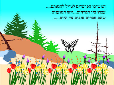 פַּרְפַּר אֶחָד לְבֵן יָצָא לָעוּף בַּשָּׂדֶה, לִרְאוֹת בִּפְרָחִים וּלְהָרִיחַ אֶת רִחֵם.